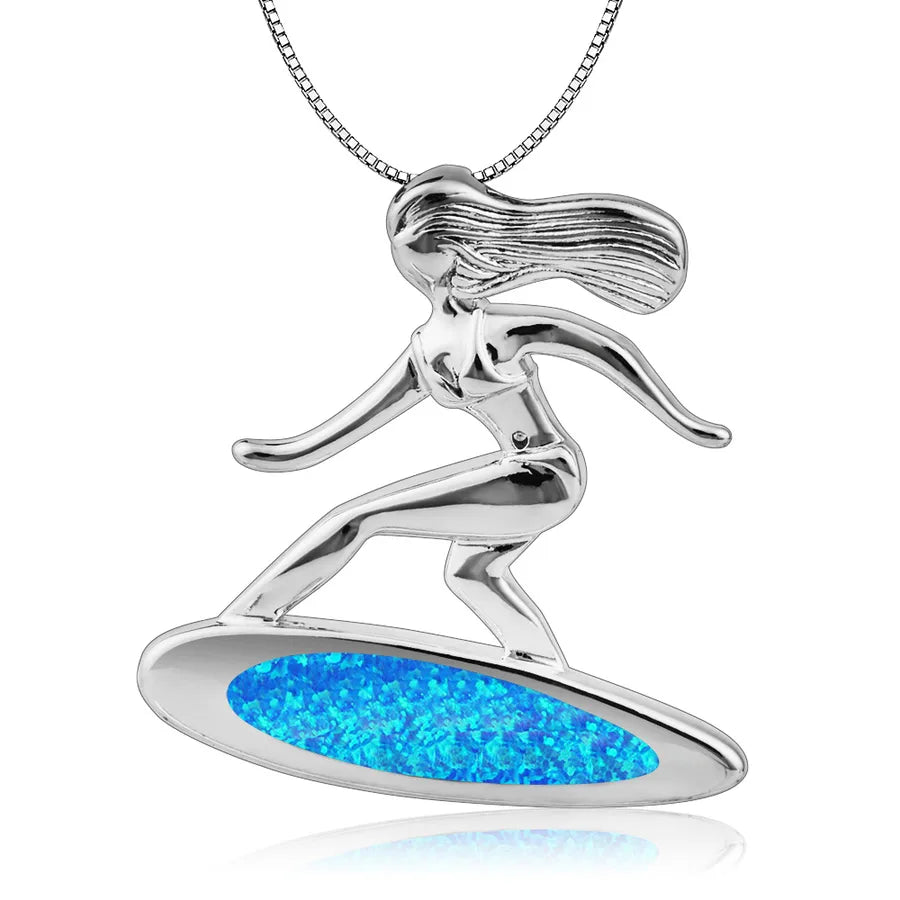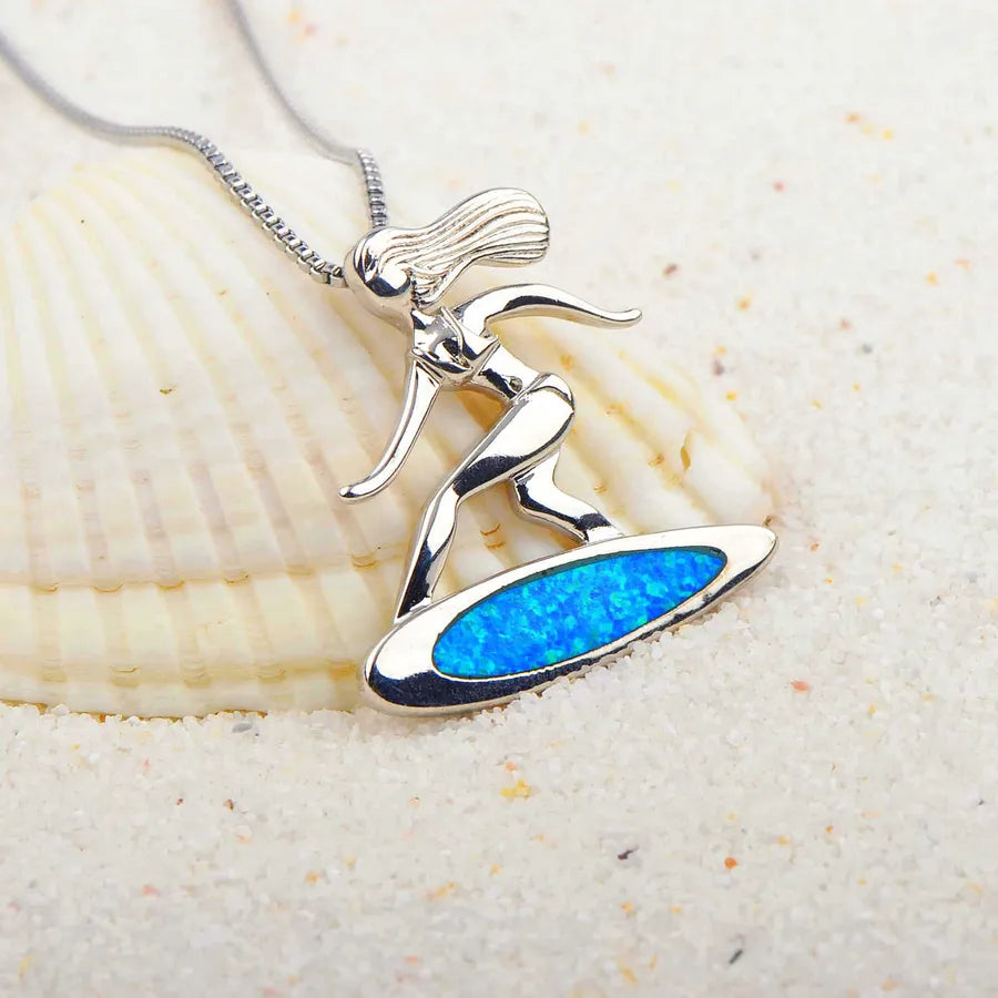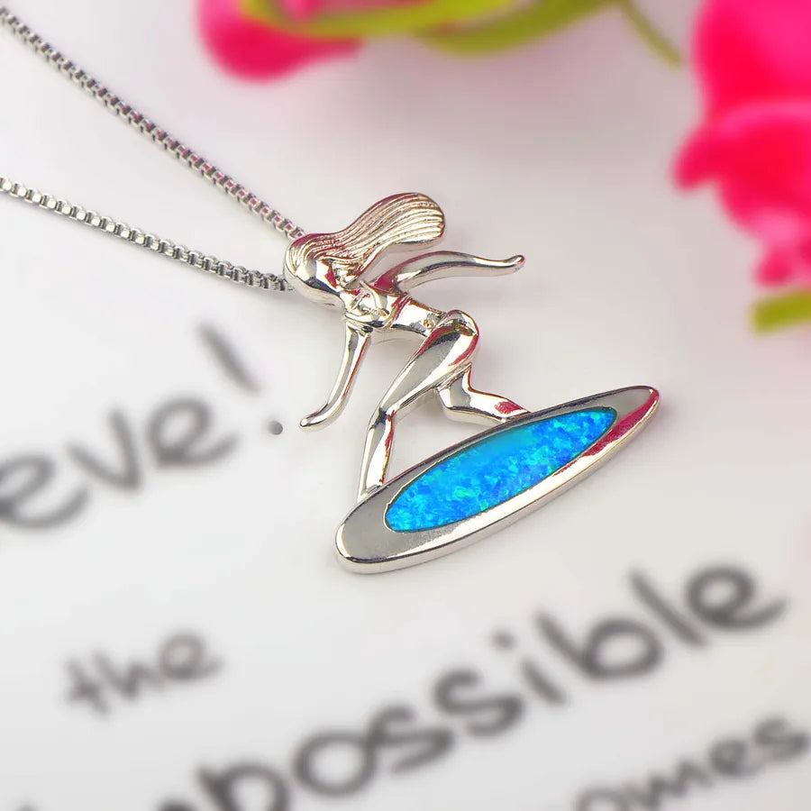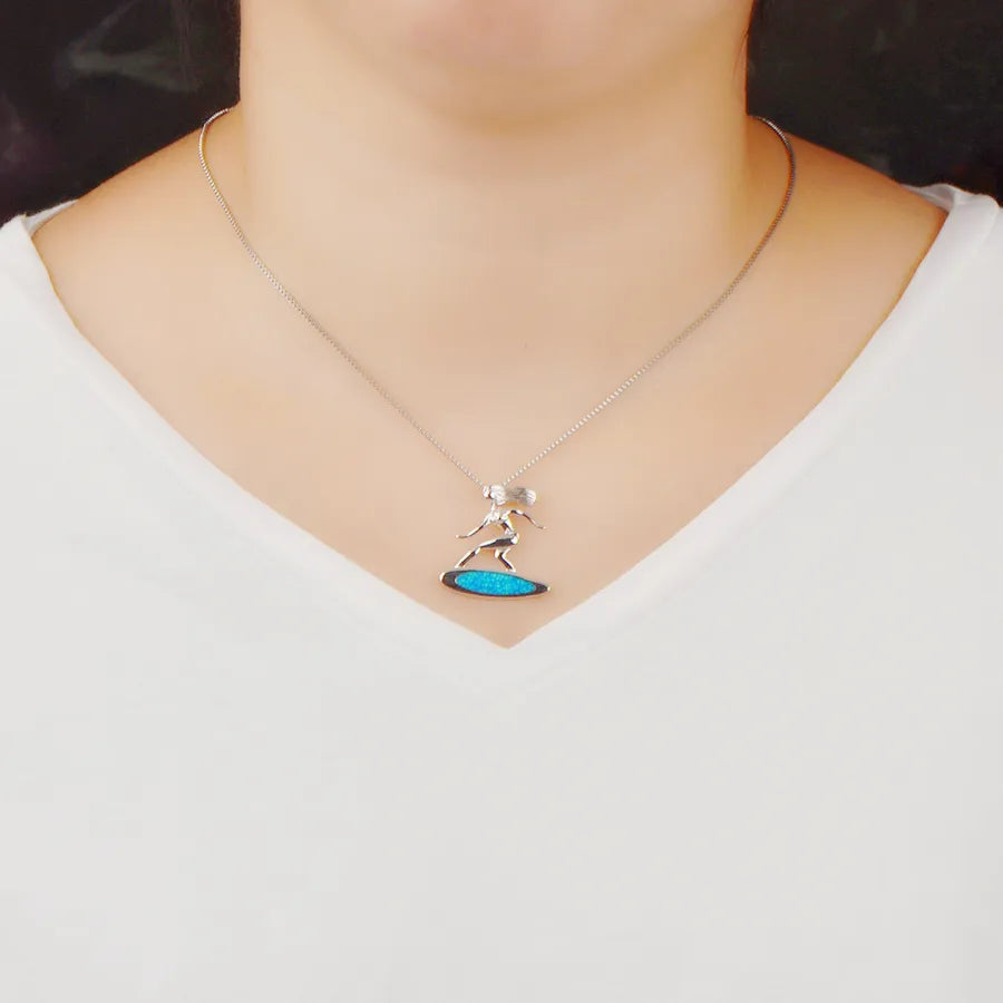 Blue Opal Surfboard Pendant Necklace Women's Fashion Jewelry Aquatic Slide Trendy Copper Animal Zodiac Design Gemstone Inlay