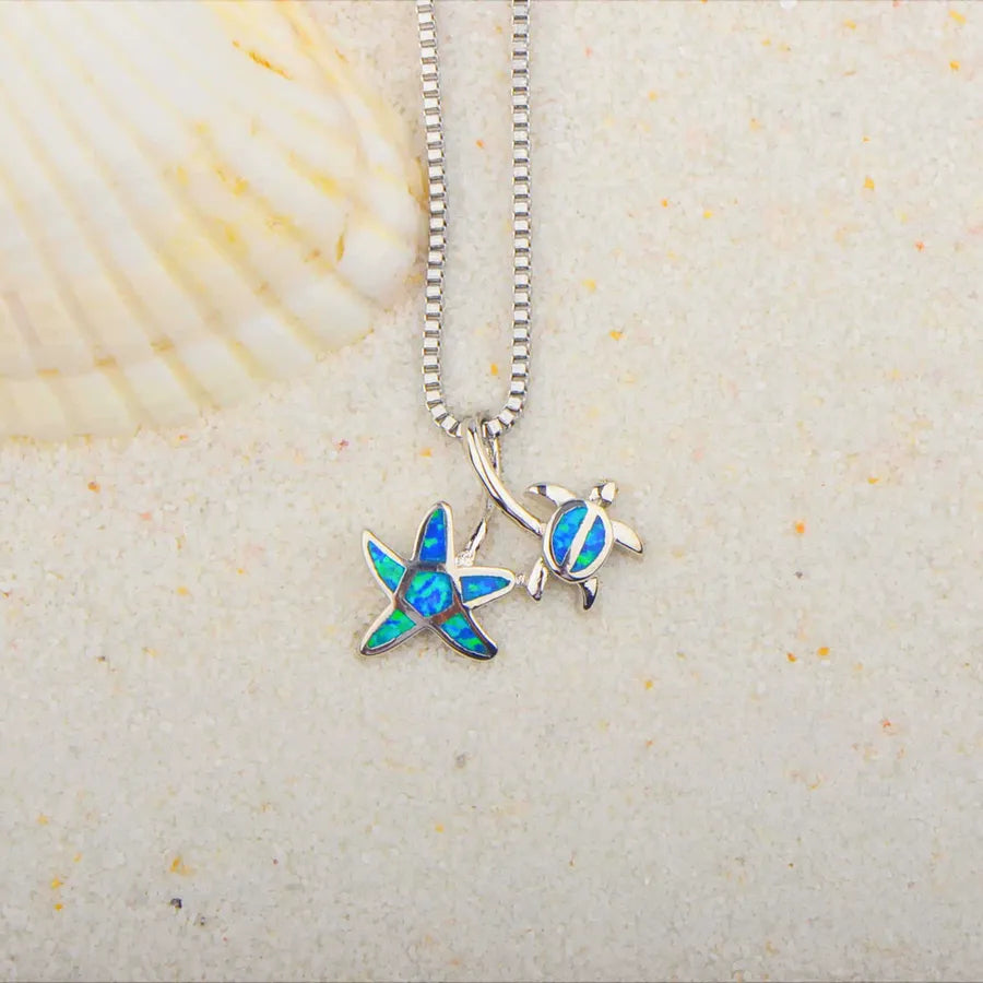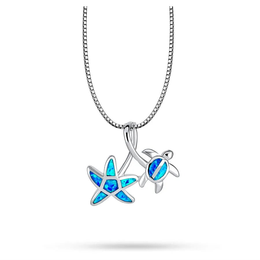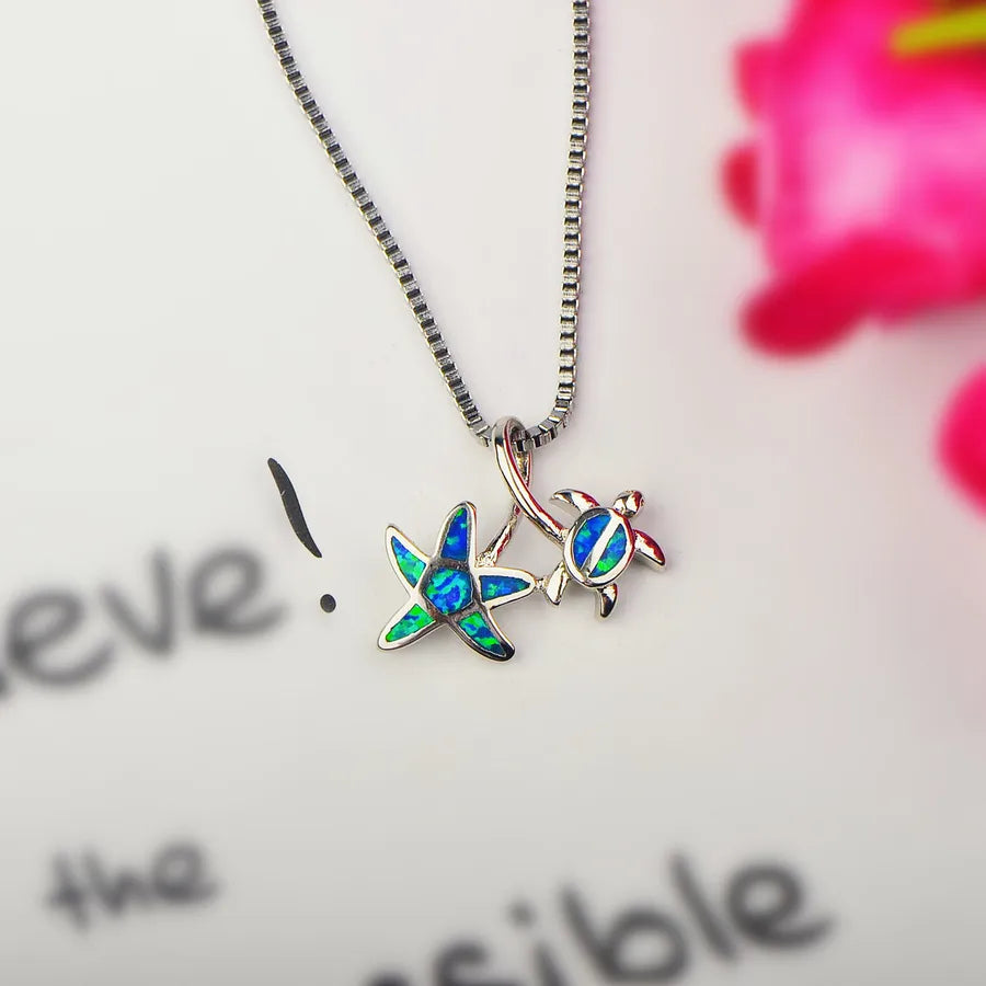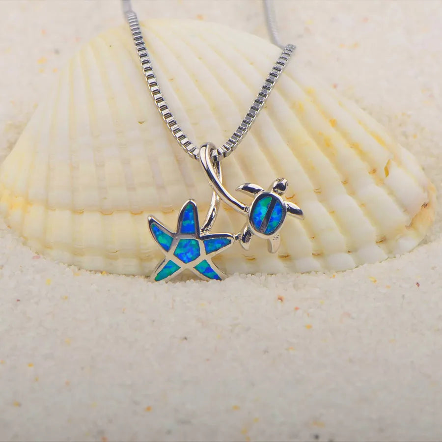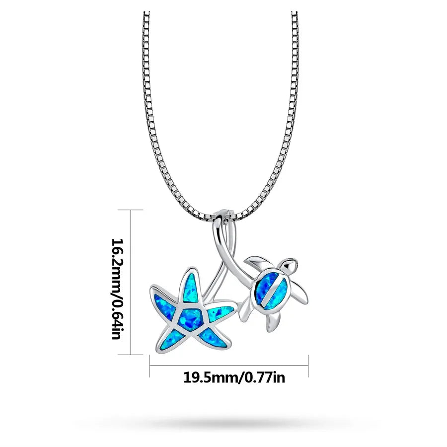 Blue Opal Turtle Starfish Necklace European Style Animal Pendants Copper Material Ins Style Jewelry Sea Turtle Sweater Chain