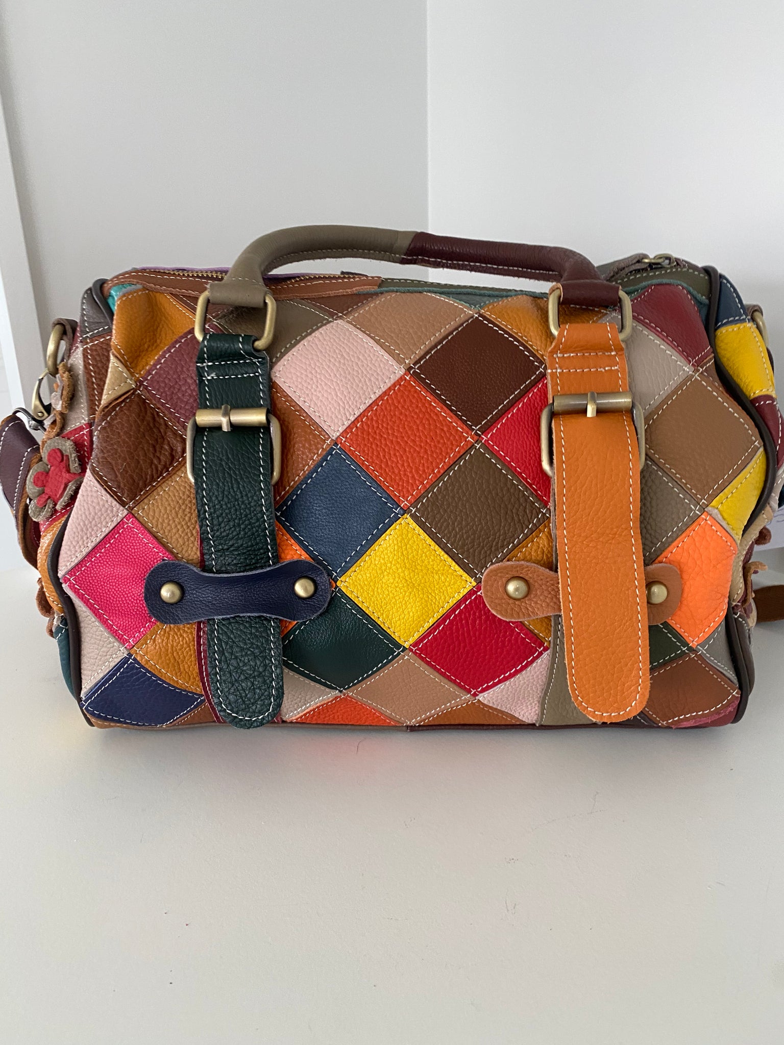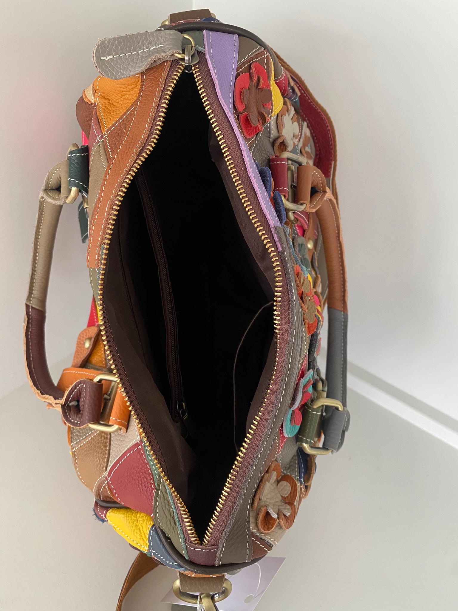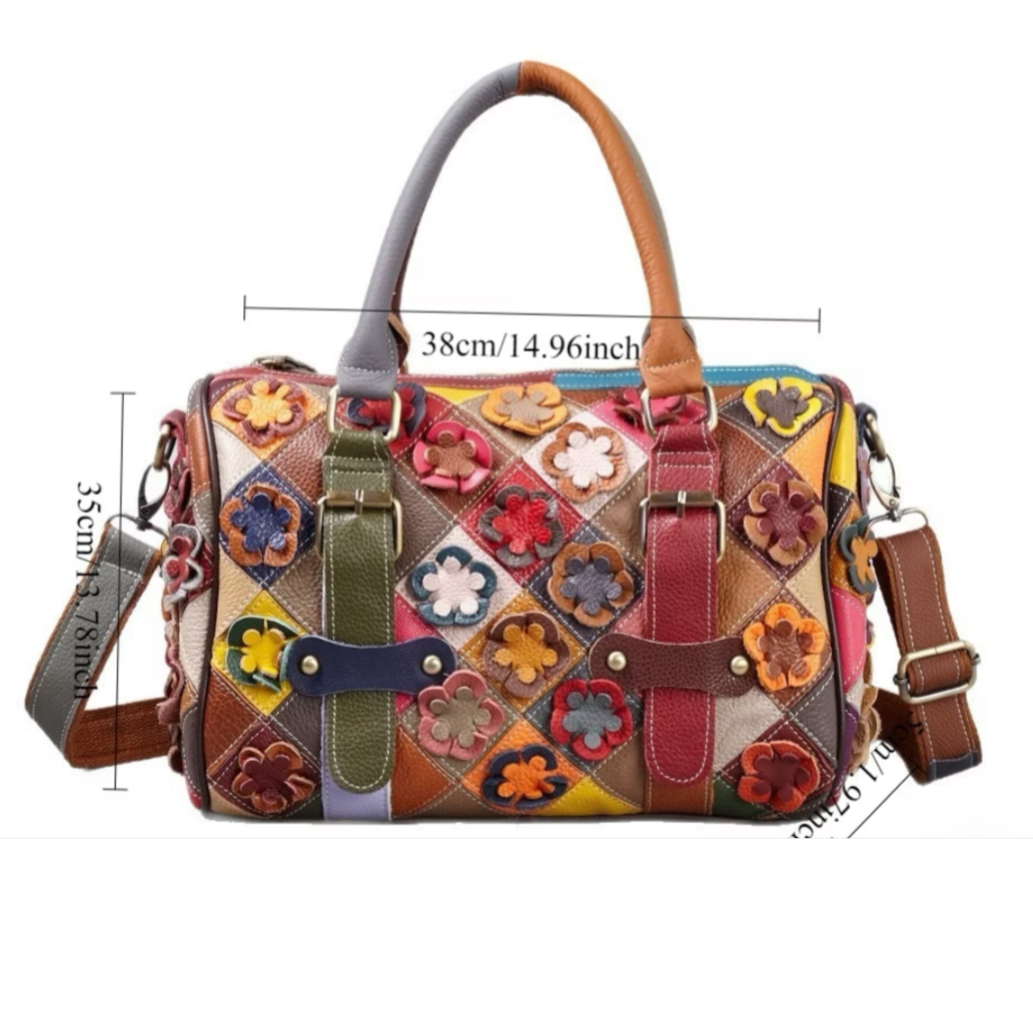 Made from full-grain leather with floral patchwork detail. Can be worn as a crossbody, shoulder bag, or carried with top handle. ✨👜