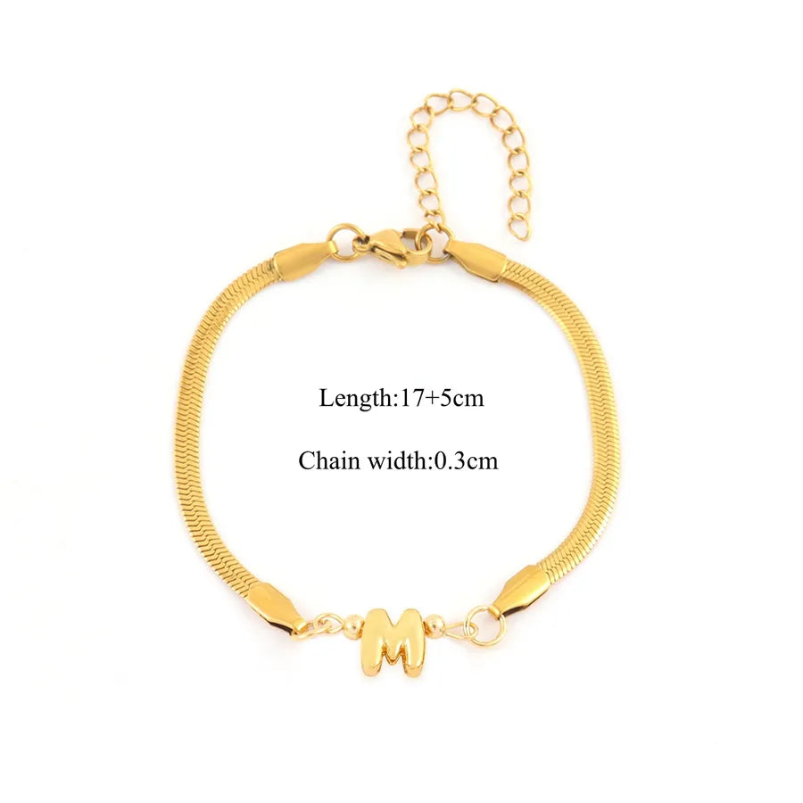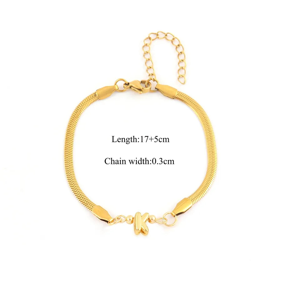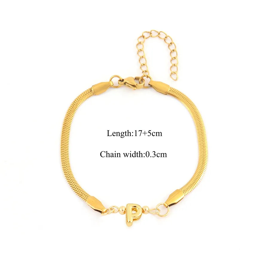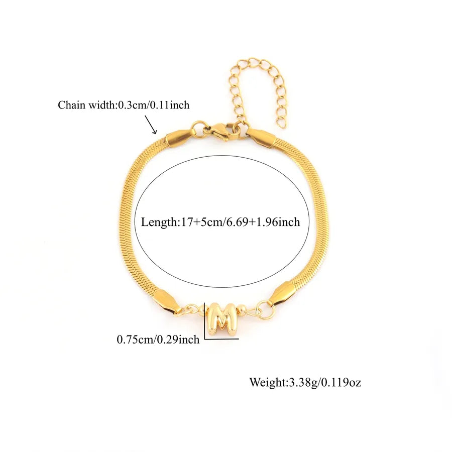 Pattern:Letter/LetterPlating Material:18K Real Gold PlatedGold Plating Process:ElectroplatedColor:GoldOccasion:DailyPendant Material:CopperGender:WomenChain Material:201 Stainless SteelClasp Closure Type:Lobster Trigger Clasp ClosureGold Plating Thickness:0.03µmQuantity:1 PieceMaterial:201 Stainless SteelClassification:BraceletsStyle:Casual,Simple StyleChain Type:snake chainCraft:Waterproof Non TarnishWeight:5g