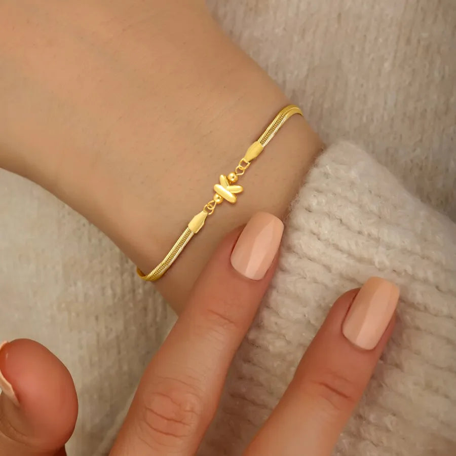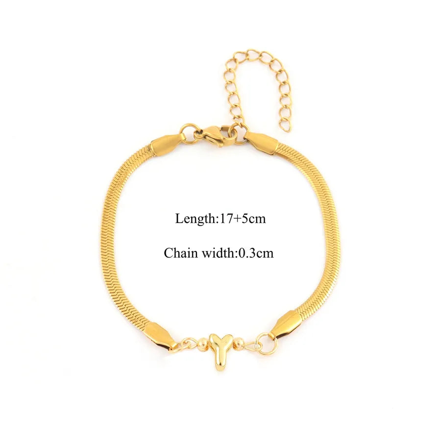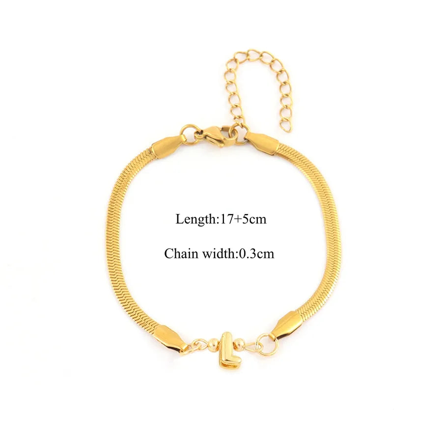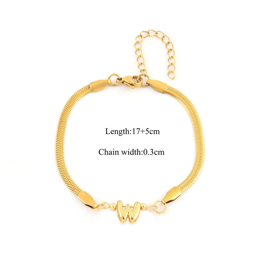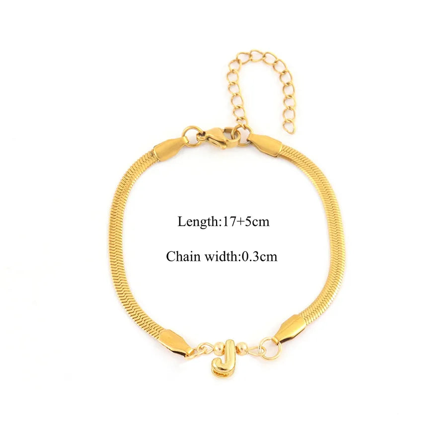 Pattern:Letter/LetterPlating Material:18K Real Gold PlatedGold Plating Process:ElectroplatedColor:GoldOccasion:DailyPendant Material:CopperGender:WomenChain Material:201 Stainless SteelClasp Closure Type:Lobster Trigger Clasp ClosureGold Plating Thickness:0.03µmQuantity:1 PieceMaterial:201 Stainless SteelClassification:BraceletsStyle:Casual,Simple StyleChain Type:snake chainCraft:Waterproof Non TarnishWeight:5g